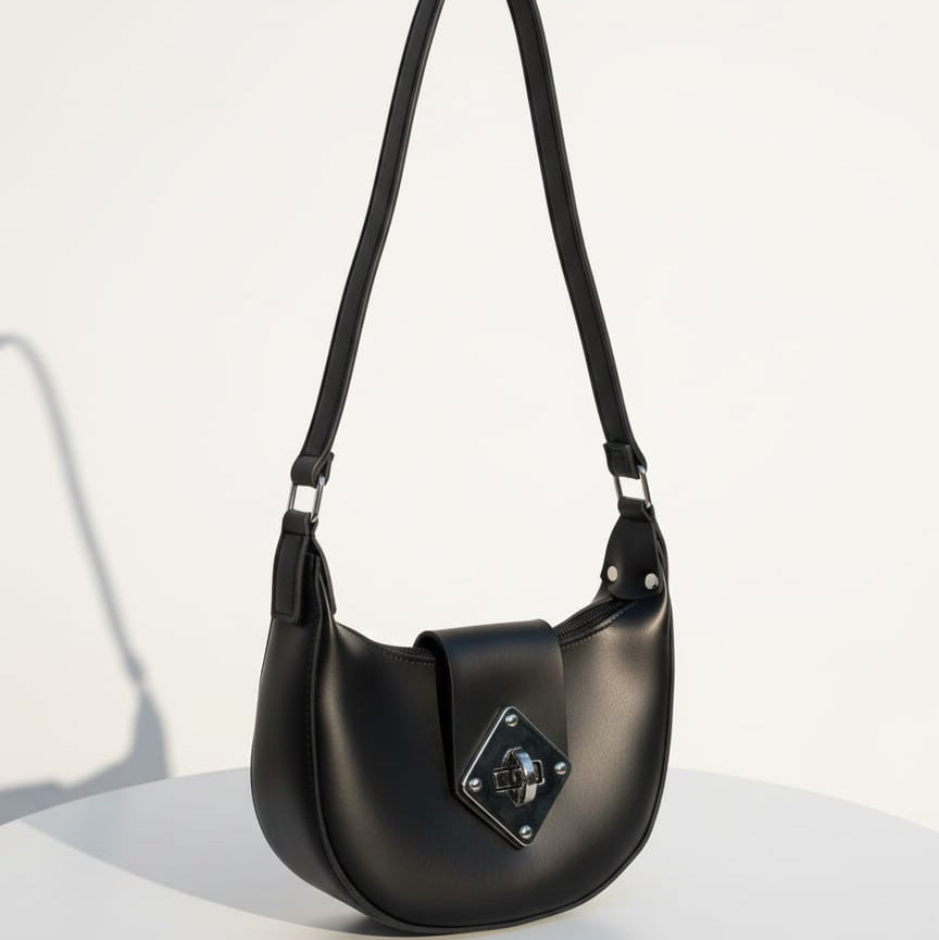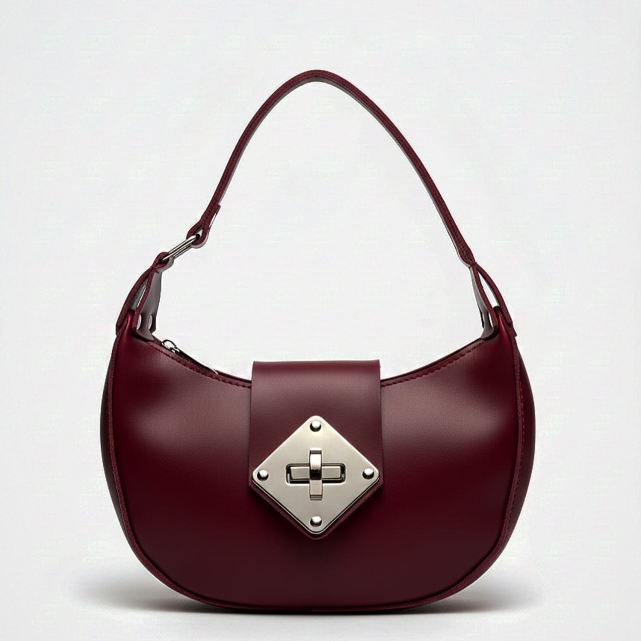 Chic half-moon handbag with a bold diamond-shaped turn-lock clasp. Features a top handle and adjustable, detachable crossbody strap for versatile, day-to-night style