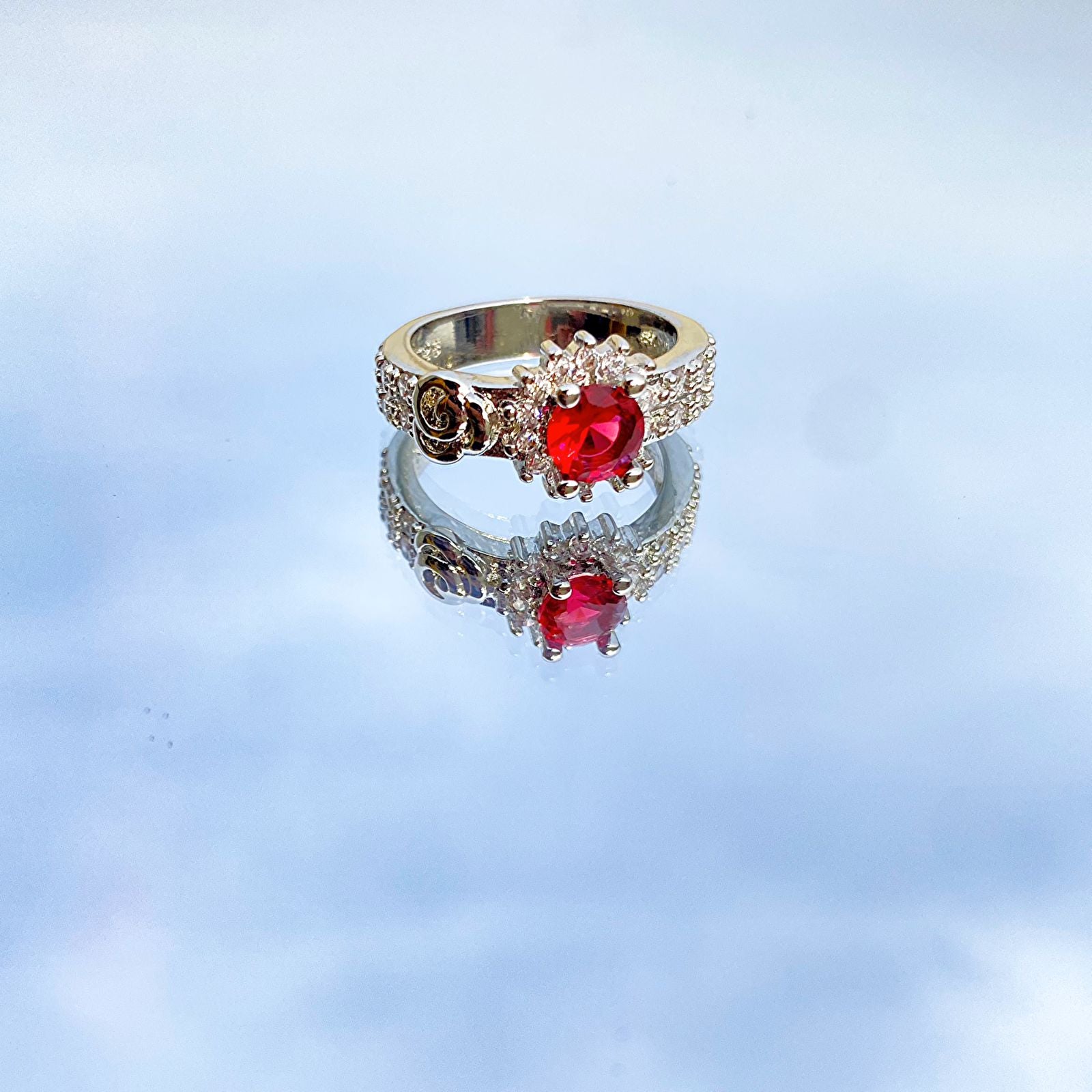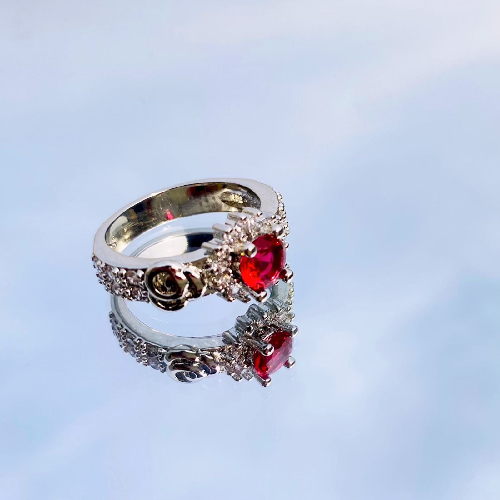 Captivate the room with a ring that balances fiery passion with sophisticated architectural design. At its heart lies a vivid, round-cut ruby-red gemstone, radiating a deep glow that symbolizes strength and devotion.