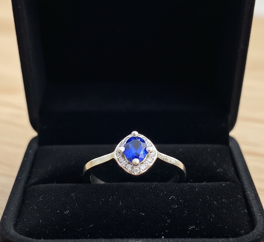 Exude royal elegance with this striking solitaire ring featuring a vibrant cobalt blue center stone. The round-cut gem is encircled by a shimmering halo of micro-crystals, designed to catch the light from every angle. Crafted with a high-polish, silver-toned band, this piece offers a classic silhouette that brings a bold pop of color to any ensemble. It’s an ideal choice for a sophisticated evening look or a meaningful September birthstone gift.