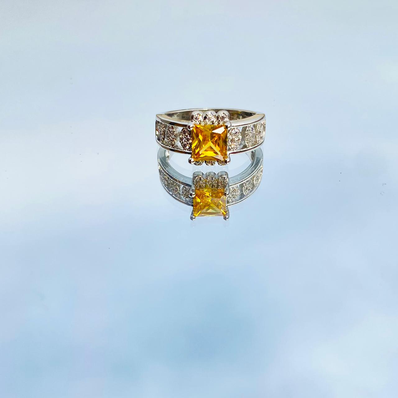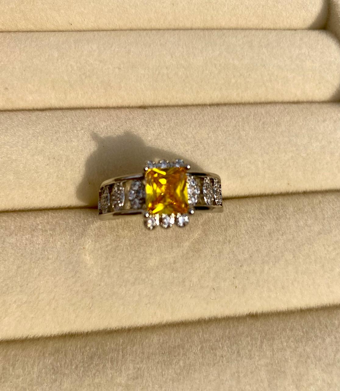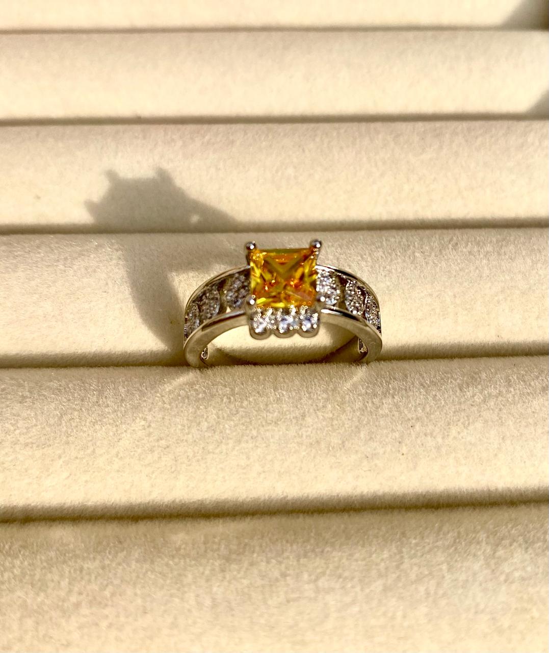 Radiating warmth and brilliance, this ring is a masterclass in architectural elegance. At its center sits a stunning princess-cut canary yellow gemstone, held aloft in a classic four-prong cathedral setting that allows light to flood the stone from all angles.Center Stone: Square Princess-Cut Vivid Yellow Gemstone.